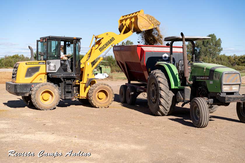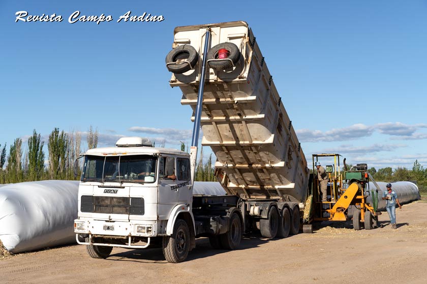 LO PRIMERO es llenar la bolsas. Cuando ya había cerrado la Jornada Forrajera, y antes de la charla con el dueño de casa, llegaban a «Renacer» las cargas de maíz (picado) cultivado en las fincas de «soporte», para pasar directo al ensilado. «A partir de ahí empieza la ganadería», diría Fernández. FOTO / Revista Campo Andino & Agroindustria.