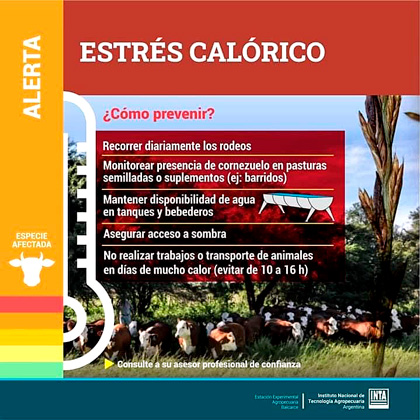 En temporada de altas temperaturas, y ante la ola de calor que afecta a gran parte del territorio argentino, el Instituto Nacional de Tecnología Agropecuaria (INTA) y el Servicio Nacional de Sanidad y Calidad Agroalimentaria (Senasa) coincidieron en recomendar la adopción de medidas de manejo, para prevenir -o al menos minimizar- los efectos del estrés calórico en los animales.
