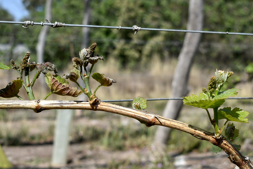 REACTIVACIÓN de crecimiento vegetativo en un brote de vid afectado por una helada tardía. FOTO/GENTILEZA Ing. Agr. Pablo Castro – EEA INTA Rama Caída (San Rafael, Mendoza).