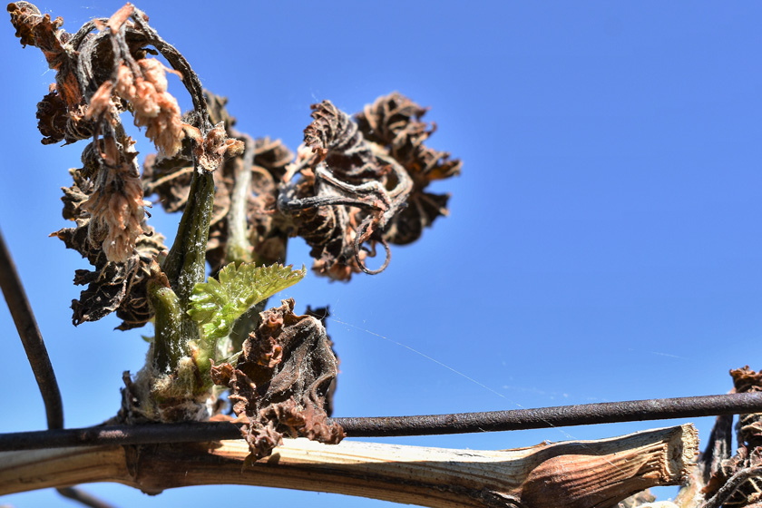“A partir de esta respuesta natural, esperable de las plantas de vid que han sufrido los efectos de una helada tardía, la primera recomendación de manejo en los viñedos es de no podar ni eliminar los brotes helados.