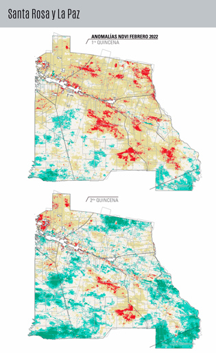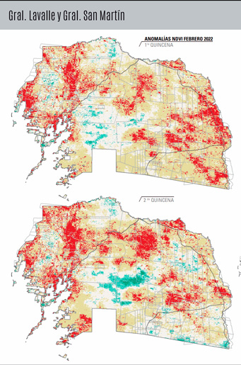 MENDOZA CENTRO. La imagen muestra las Anomalías NDVI registradas en el secano de Santa Rosa y La Paz durante febrero 2022. INFOGRAFÍA/EEA INTA Rama Caída.