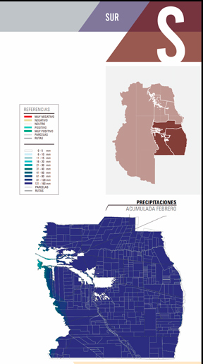 MENDOZA SUR. Estimación de precipitaciones acumuladas durante febrero en el secano sureño con producción bovina. La mitad superior del cuadro «Referencias» remite a la infografía anterior, que grafica la Anomalías NDVI de febrero observadas en esta zona. INFOGRAFÍA/EEA INTA Rama Caída.