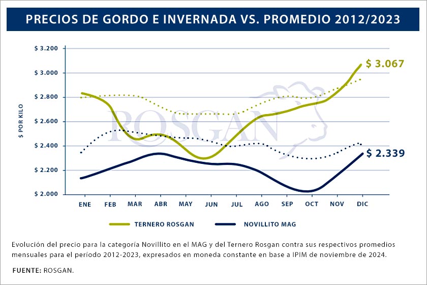 «Si tomamos como referencia el valor del ternero Rosgan medido a moneda constante, los $3.066,83 conseguidos en diciembre logran superar en un 4% el valor promedio registrado para el periodo 2012-2023» .
