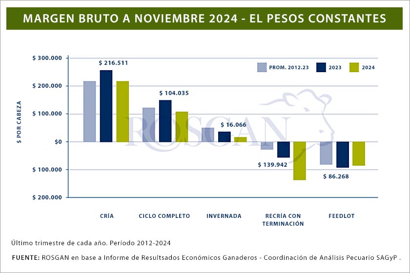 La analista del Rosgan interpreta que -de acuerdo a ese informe, y en líneas generales- «todas las actividades ganaderas, desde la cría e invernada hasta el engorde, en sus diferentes esquemas, están trabajando con márgenes brutos inferiores a los obtenidos un año atrás».