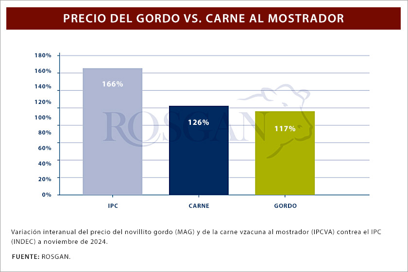 Detalla, en ese sentido, que «los precios de la carne al mostrador en los últimos 12 meses aumentaron un 126% contra una inflación que, según datos del INDEC a noviembre, alcanzó el 166% interanual» .