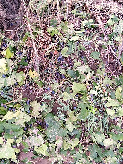 RACIMOS enteros y bayas fueron arrancados, y quedaron al pie de las plantas reducidos a una masa verde que remite a la furia del meteoro que se abatió sobre una vasta zona productiva del Este mendocino. FOTO/GENTILEZA Romina Molina.